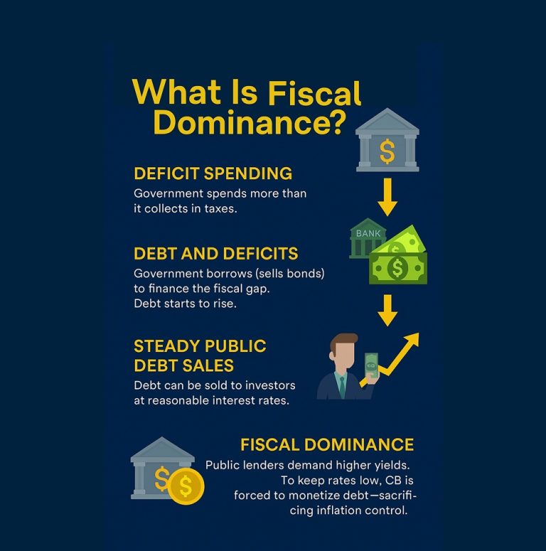 Fiscal dominance occurs when a government’s borrowing needs dictate central bank policy. Instead of focusing on inflation, the central bank is forced to keep interest rates low and buy government bonds to prevent a debt crisis.