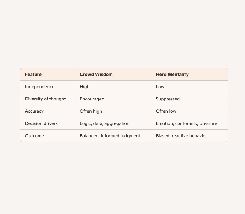 Crowd wisdom happens when individuals think independently, bringing diverse ideas to the table. It’s how we get accurate predictions, smart solutions, and balanced decisions.