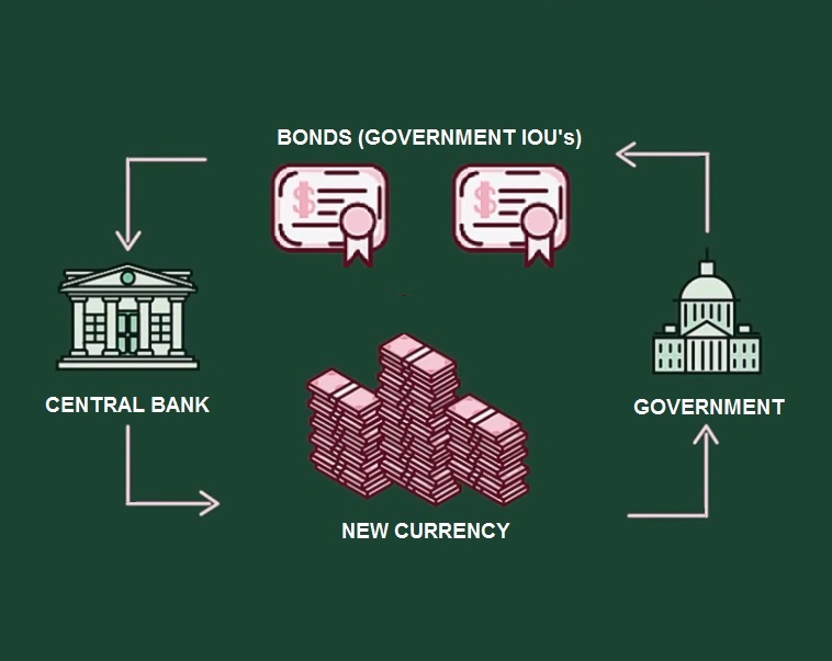 - Buying Bonds: The Central Bank steps in and buys these Government Bonds from the open market. When the Central Bank purchases these bonds, it credits the sellers’ bank accounts with New Currency, effectively creating money out of thin air.