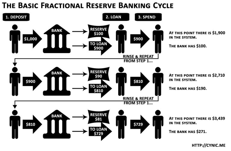 This process allows banks to multiply the amount of currency in the economy, known as the currency multiplier effect or infinite currency glitch. It can be a tool economic growth, if the loans are made for productive business investments. But this also comes with risks, such as financial instability if loans are made for speculative investments, such as stock market bubbles, realestate bubbles, …